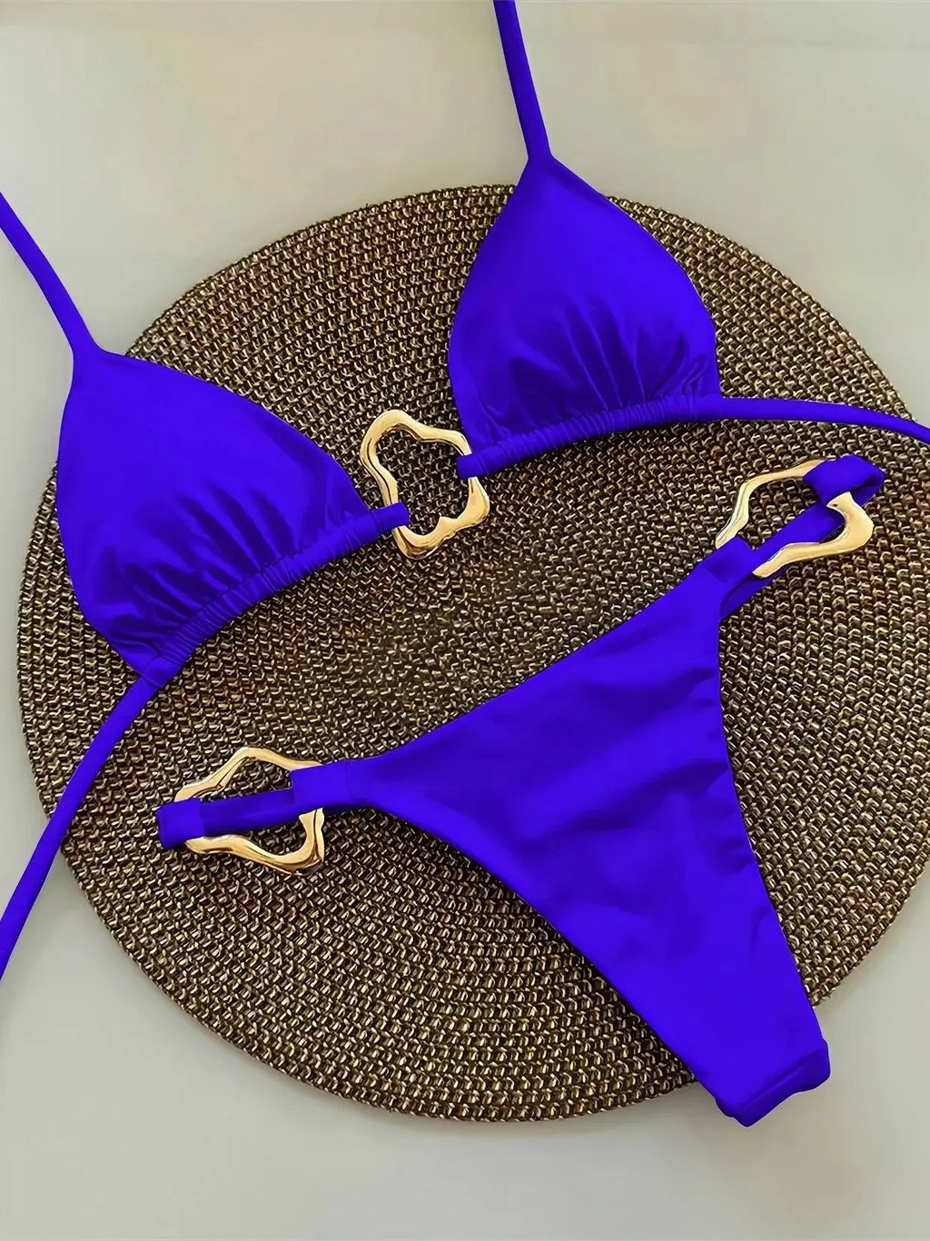 Com decote halter, cintura baixa e um visual moderno totalmente sólido, o conjunto transmite elegância minimalista — perfeito para quem prefere um estilo praia mais sofisticado e leve.